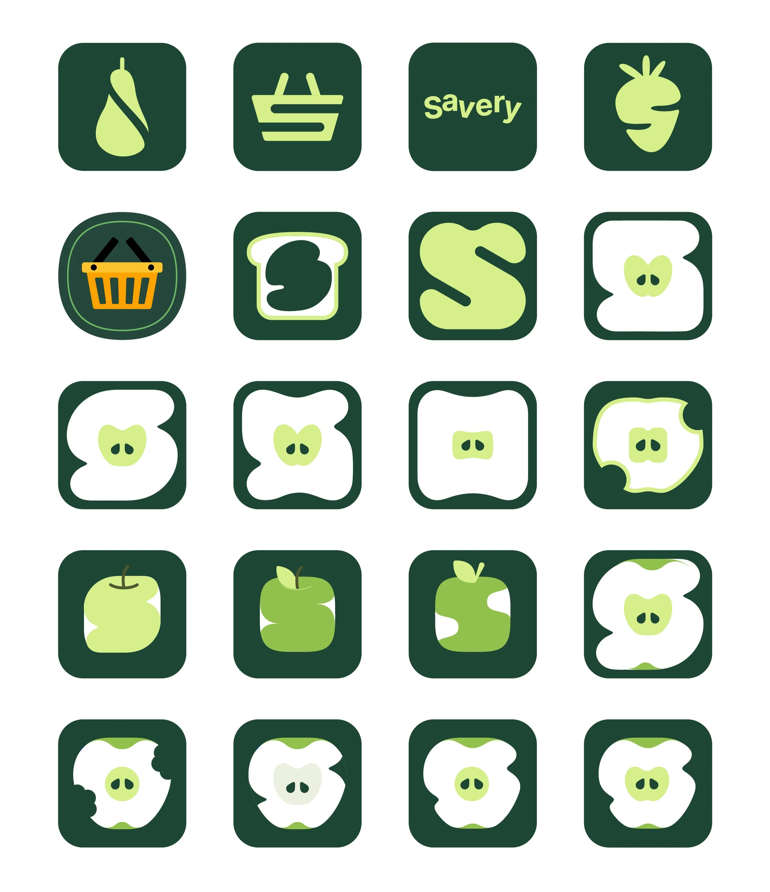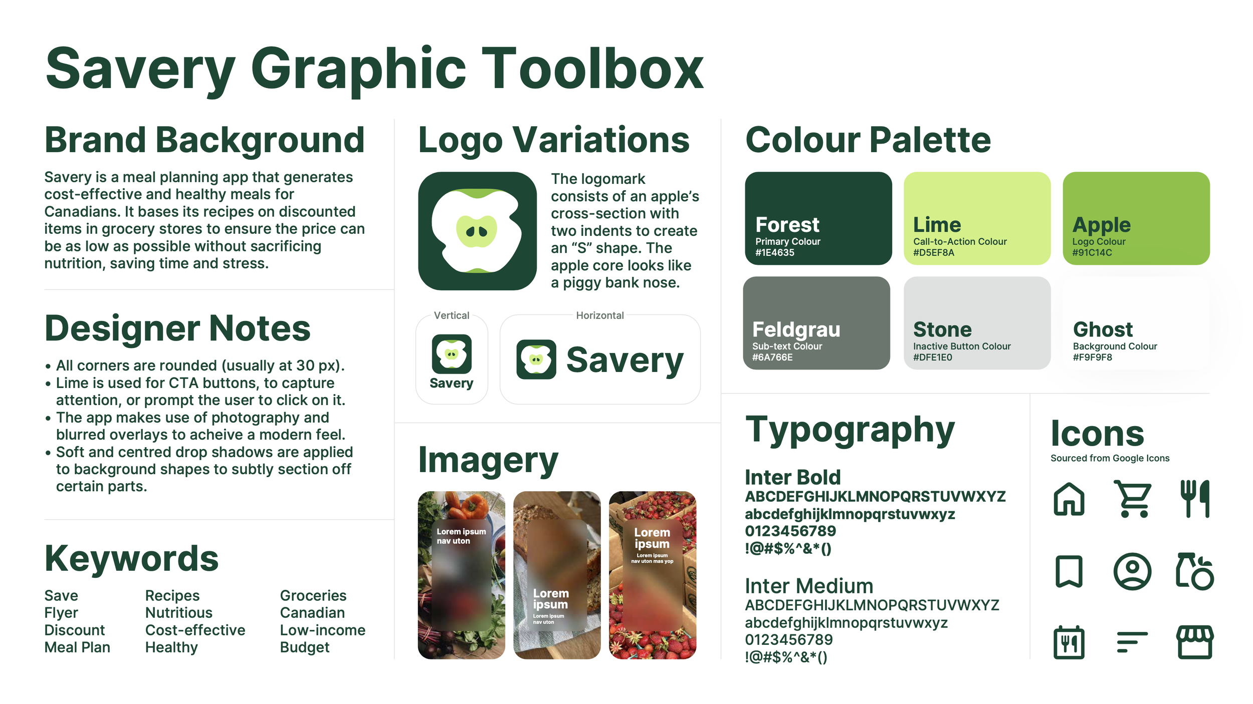 The logo is a cross-section of an apple with two notches to make the overall shape look like an “S” for Savery. The apple’s core can also be interpreted as a piggy bank nose to allude to money and budgeting. The company name is a blend of “save” and “savoury.”