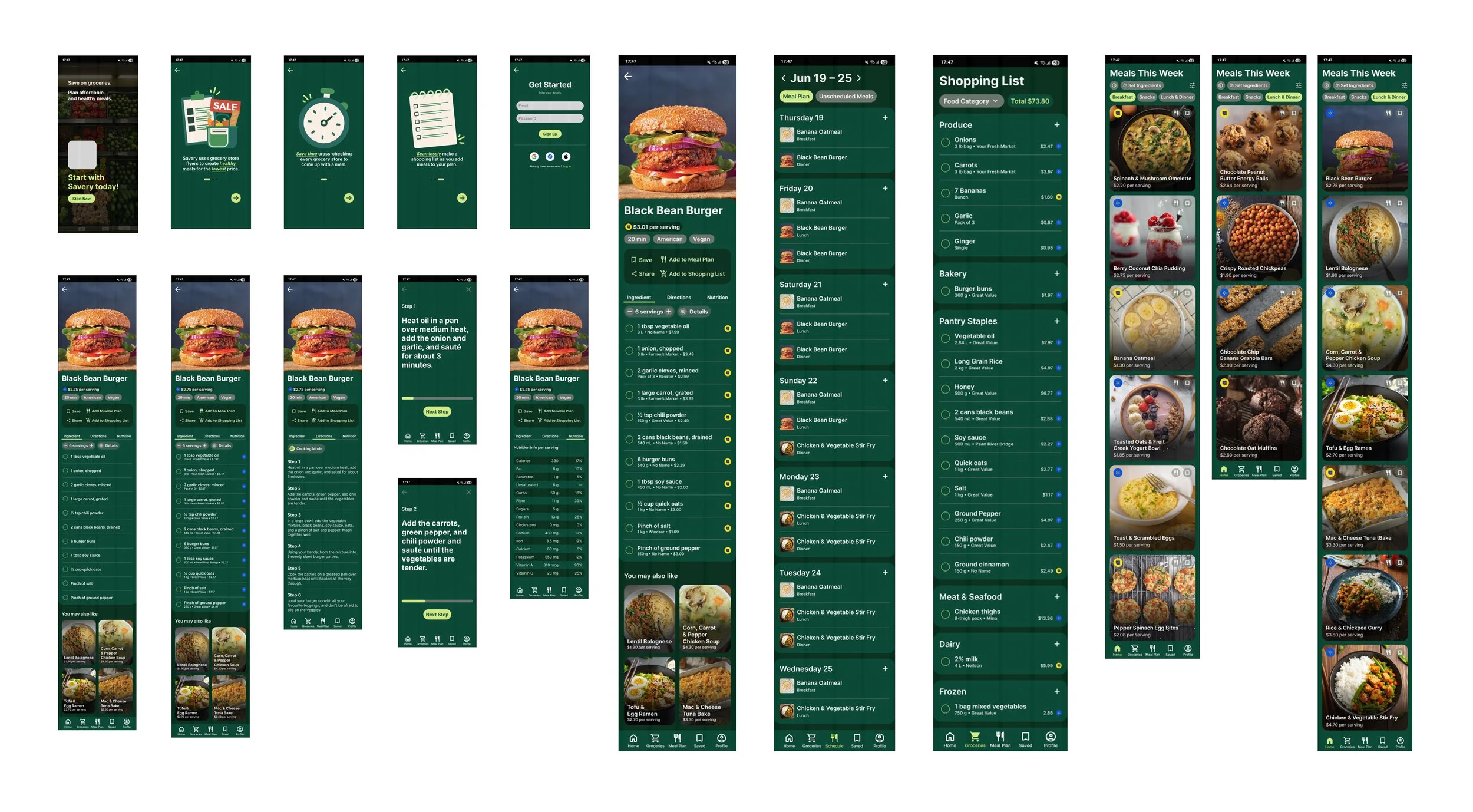 The medium- to high-fidelity wireframes initially had a dark green background for the branding. However, after consideration, the final screens were changed to an off-white for more airiness and modernism. This change allowed for the food to look more appetizing, have a cleaner layout, and be more accessible.